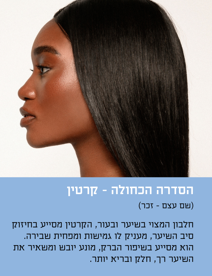 מרכך ללא מלח המכיל חלבון קרטין וחומרים מרככים. הקרטין מסייע לשקם, לחזק ולהגן על השיער, בעוד שהחומרים המרככים שומרים על רכותו ומגנים עליו מפני יובש ונזקים מטיפולים כימיים כמו צביעה, החלקה וסלסול. מרכך קרטין מותיר את השיער רך וקל לסירוק.